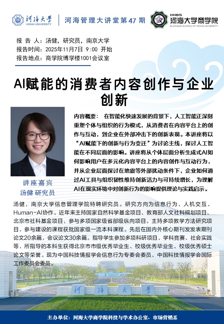 学术讲座通知:AI赋能的消费者内容创作与企业创新