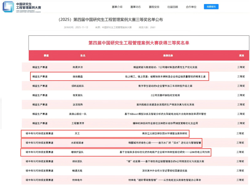 此外,足球賽事直播 工程管理硕士(MEM)四个案例获大赛三等奖,分别是由张可教授指导,陶前林、顾志恒、张顺等同学合作完成的《轨上精工,链上筑基:破解地铁车辆制造企业供应链质量管控的精准之道》案例,获“精益生产赛道”三等奖;由黄晶副教授指导,黄安、赖思航等同学合作完成的《南京江北新区研创园水环境整治案例研究》案例;由陈军飞教授指导,程右东、杨东东等同学合作完成的《唤醒城市的绿色心跳——一座污水厂的“活水”进化论与管理智慧》案例;由李弘扬教授、沈楷程老师联合指导,陆轶君、战文辉、瞿濡岱、黄绍泰同学合作完成的《基于全链条多目标优化的热电联产企业碳中和转型路径研究——以NH热电公司为例》案例。