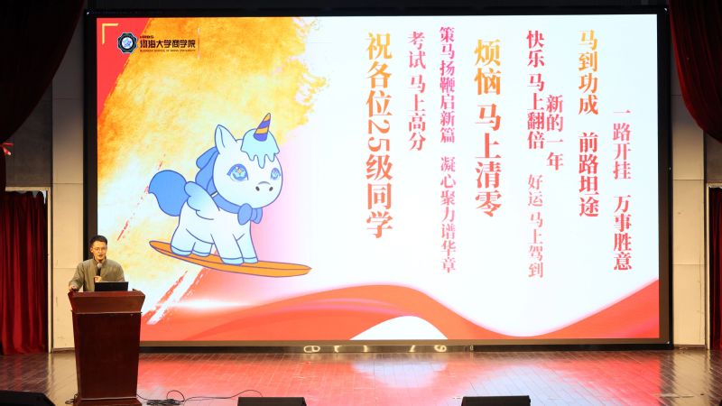 汇报结束后,年级大会正式拉开帷幕。陈鹏老师肯定了全体同学在本学期新生教育活动中展现出的积极风貌,随后立足学习规划与教育管理两大核心,为同学们明确了下一阶段成长方向。学风建设方面,陈老师对比剖析了大学与高中学习模式的差异,结合期中考试系统分析了各班学业发展情况,着重强调了大一学年夯实学业基础的重要性,呼吁全体同学树立优良学风,建立良性互助的学习氛围。日常管理方面,陈老师系统讲解了日常要求、PU学分、请销假制度等基本规范,同时对寒假社会实践开展、假期安全教育等工作提出具体说明,并祝福全体同学新的一年实干笃行、在大学乃至更长的人生道路上行稳致远。